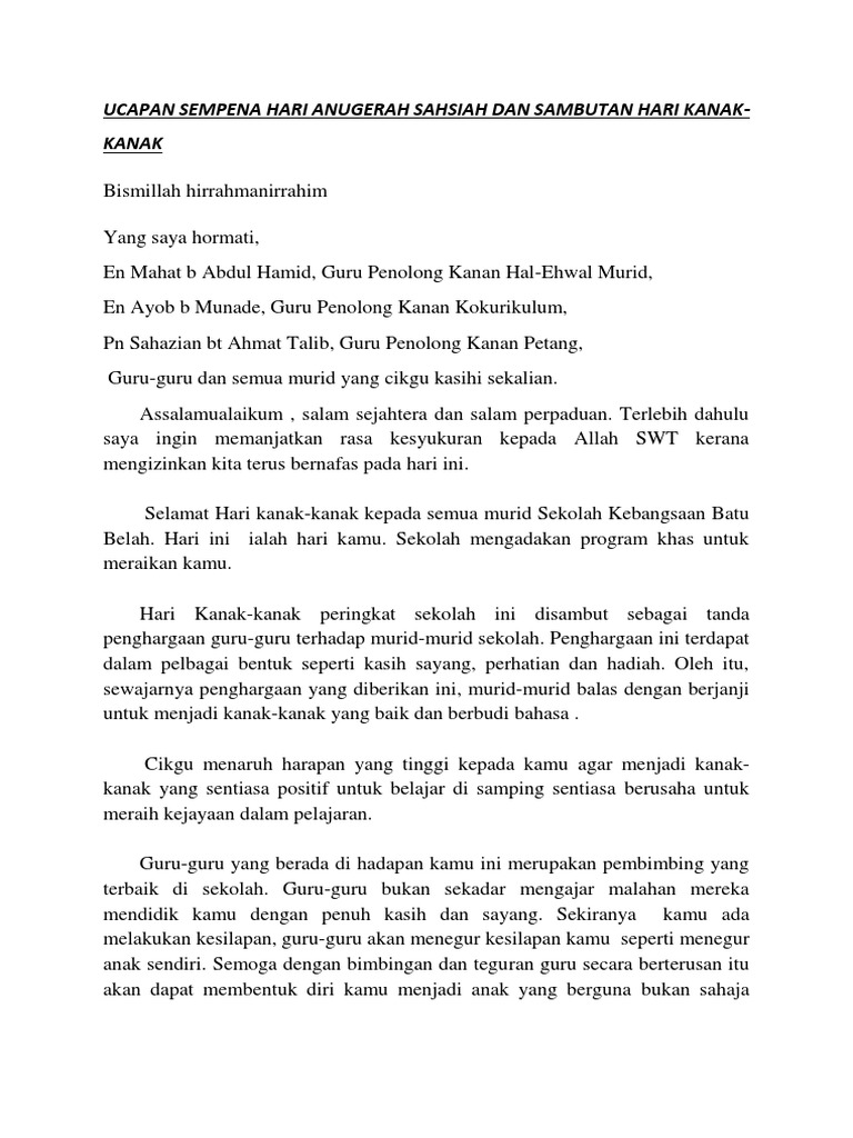 Sehingga 30 Jun 2019 koperasi sekolah berjumlah 2433 buah dengan keanggotaan 16 juta orang syeryuran berjumlah. Teks Pengacara Majlis Hari Sukan Sekolah Tahun 2011. Temasya Sukan Sekolah diadakan pada setiap tahun adalah untuk membina semangat kesukanan anak-anak kita.
